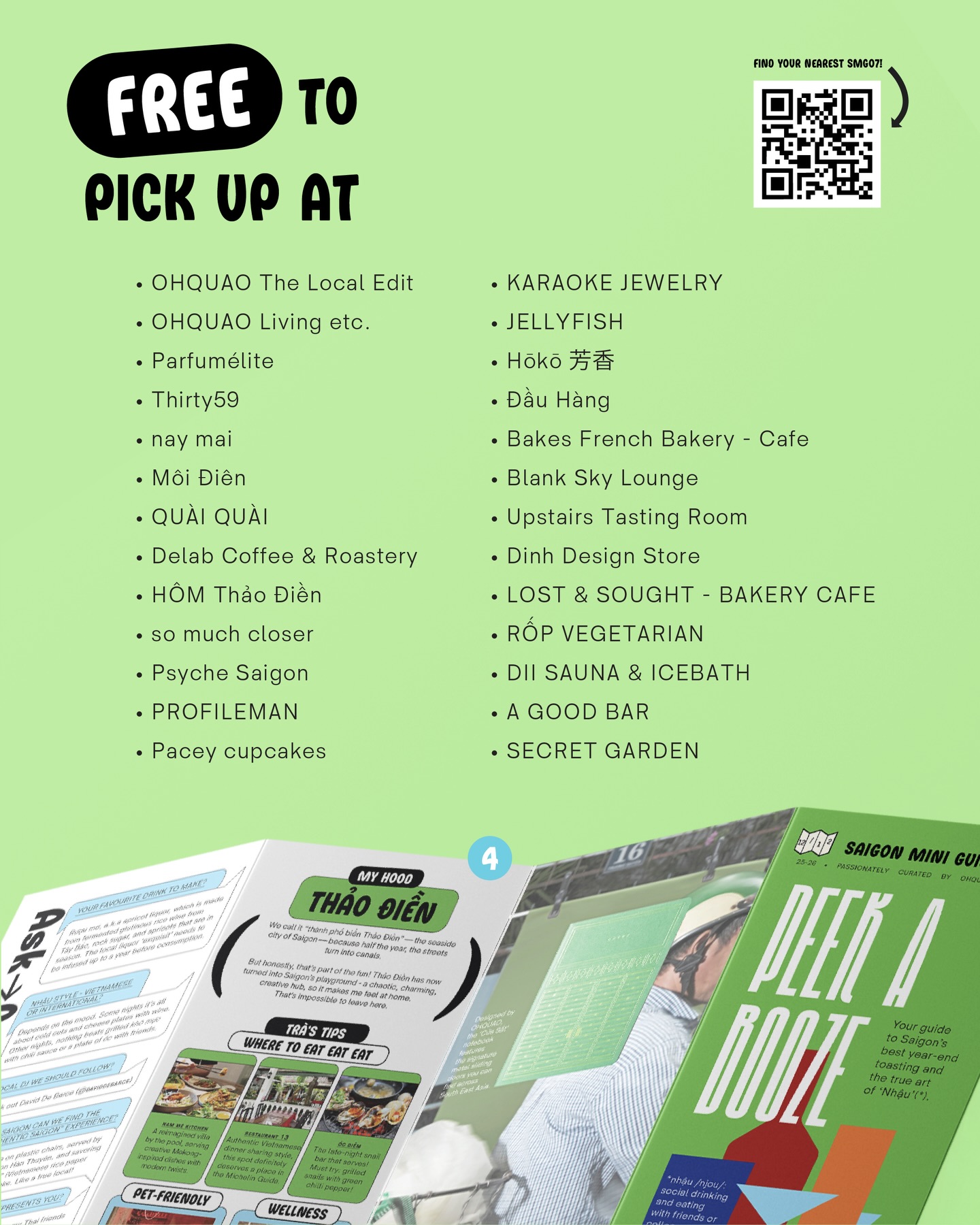 SAIGON MINI GUIDE số mới nhất – ISSUE 07 mang đến thêm một cách để bạn bước vào cuộc dạo chơi này. Từ nay, bạn có thể quét QR để mở Google Map, tìm điểm pick-up SMG07 gần nhất — và để cuộc vui bắt đầu từ đây.